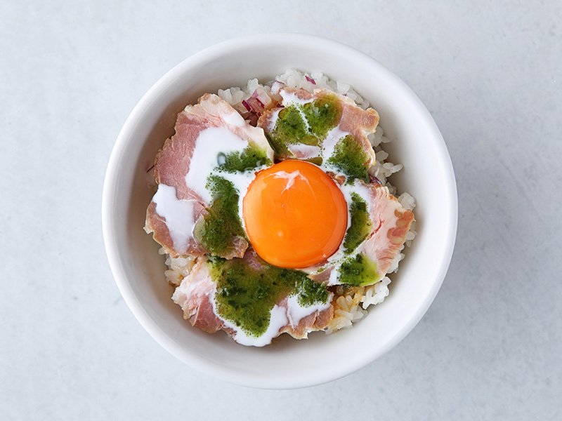 宮城県産「つや姫」の魅力を最大限に引き出したローストポーク丼。じっくりと低温調理され、しっとりと仕上げたチャーシューに、燻製醤油を使った特製ダレやバジルソースと卵で、銀シャリとのハーモニーが絶妙な限定の丼をぜひご賞味ください。